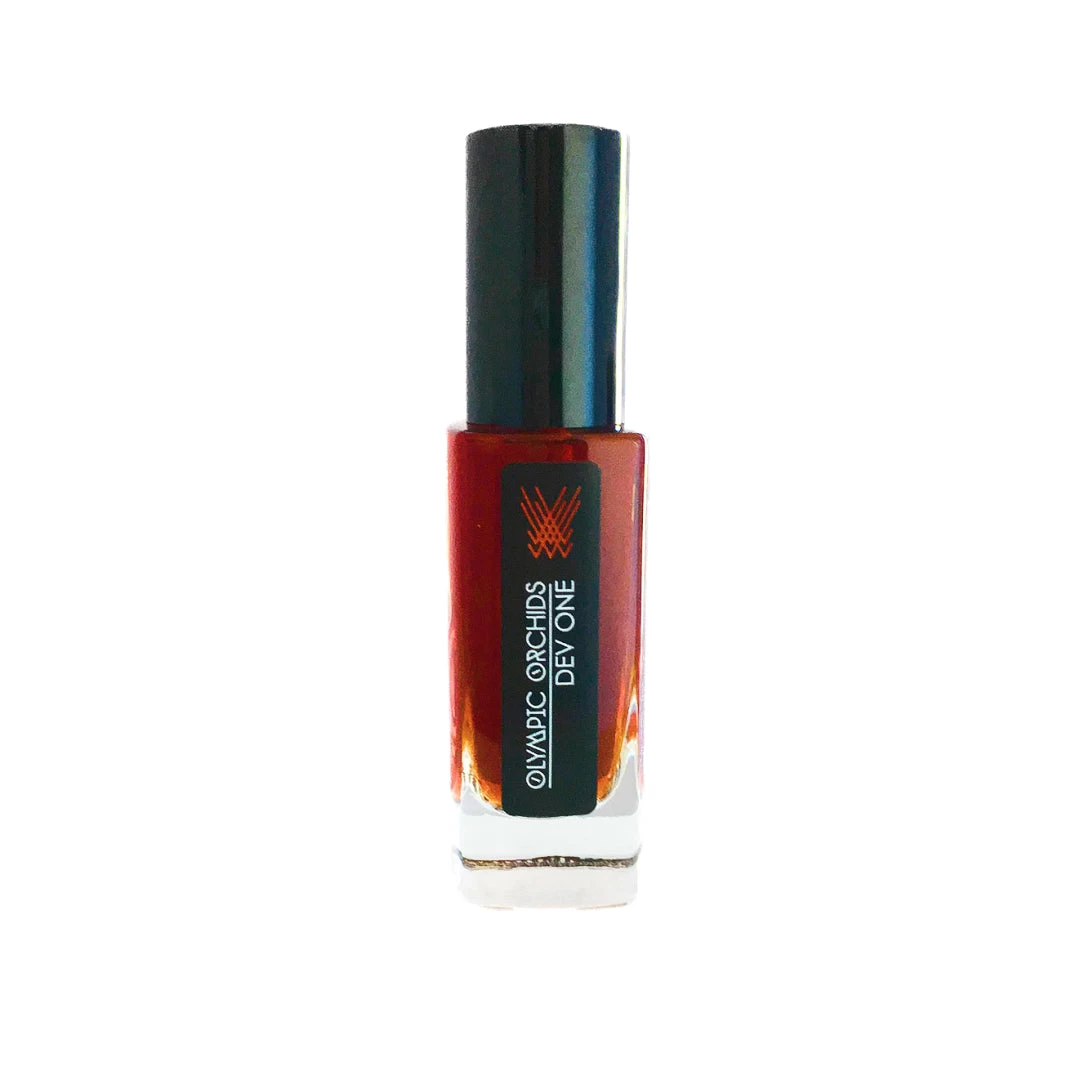 Dev One is the scent of falling in love despite misgivings and against one’s better judgment, a scenario in which bright top notes play against a dark and foreboding base. The happiest of the series, Dev One represents the early phase of the story told by Sheila Eggenberger in her novel Quantum Demonology, in which the female protagonist is being tempted and seduced into a neo-Faustian deal with the devil.