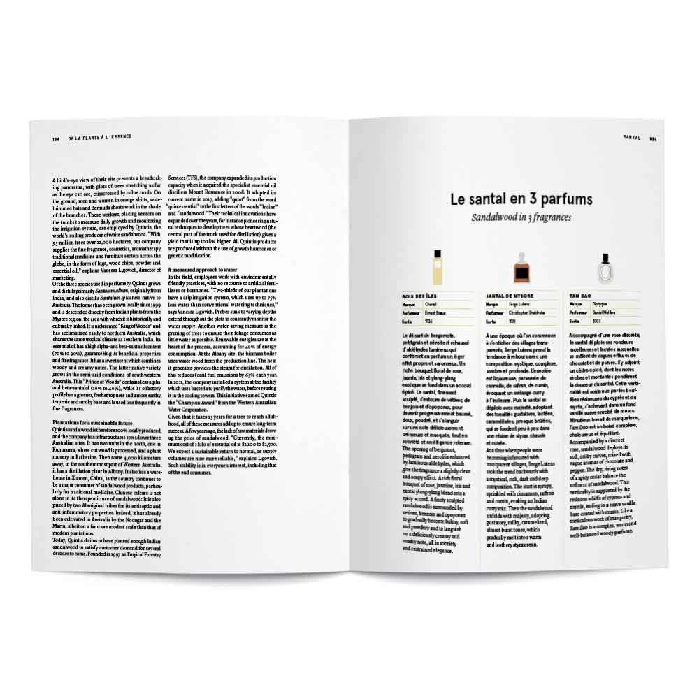 Vanilla, jasmine, bergamot, musks … Thirty chapters explore the diversity and richness of perfumery ingredients: their origins, cultivation, transformation and usage, as well as the innovations devised to address the environmental, economic and social challenges of today.