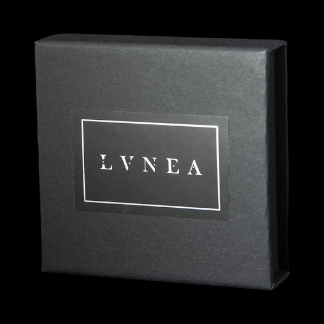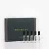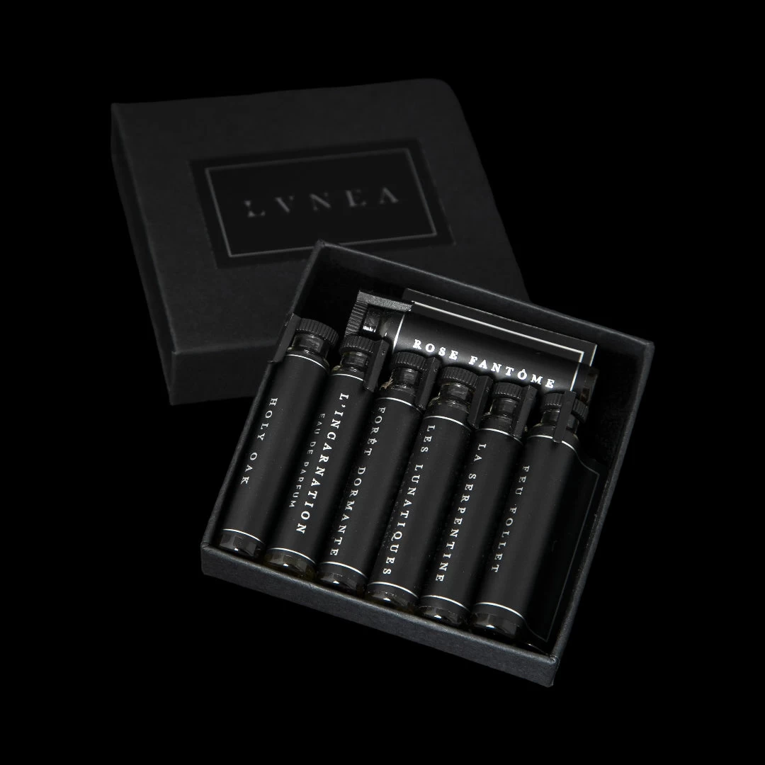A sample set of all seven of Lvnea’s all-natural eaux de parfums. Seven hand-filled 2ml samples in clear glass vials (no sprayer), presented in a black cardboard box with velvet inlay.